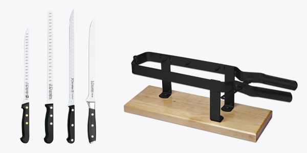 Zde najdete nože a stojany vyvinuté speciálně pro krájení sušené šunky. Nože jsou tenké a pružné, díky čemuž umožňují krájet mimořádně tenké plátky. Stojany zajistí bezpečné upevnění prosciutta (celé kýty nebo vykostěných kusů) a pohodlné servírování – vše pro dokonalý zážitek z krájení prosciutta přímo u vás doma.