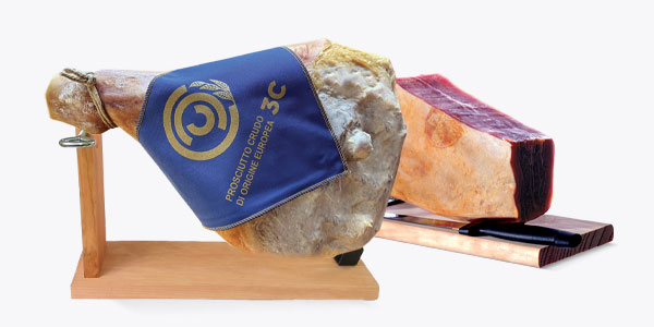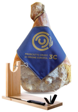Set půlky zadní nohy (kýty) DOP San Daniele se stojánkem a nožem. Délka zrání 20 měsíců. DOP San Daniele. Složení: vepřové maso, sůl.