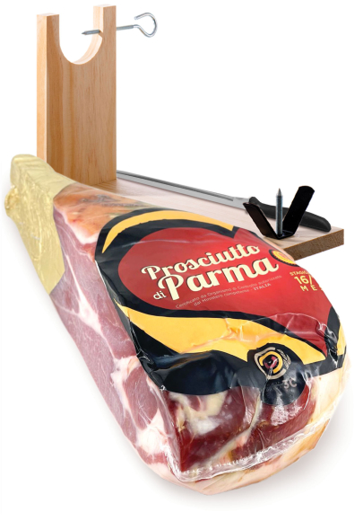Set půlky vykostěné zadní nohy (kýty) Prosciutto di Parma se stojánkem a nožem. Délka zrání 16 měsíců. DOP Parma. Složení: vepřové maso, sůl.
