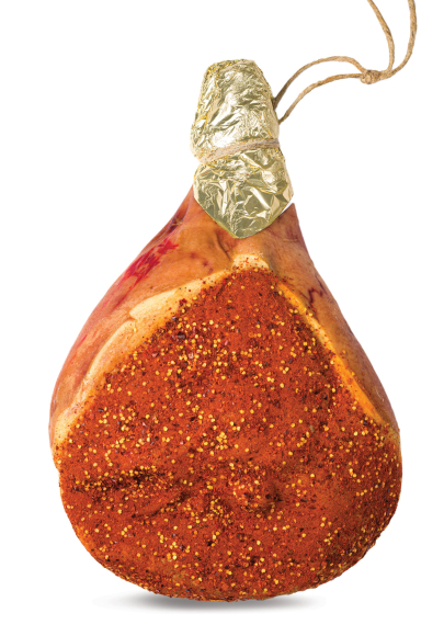Zadní noha (kýta) z bílého prasete s délkou zrání 12 měsíců. Prosciutto je obalené v červeném chilli koření. Složení: vepřové maso, sůl, pepperoncino.