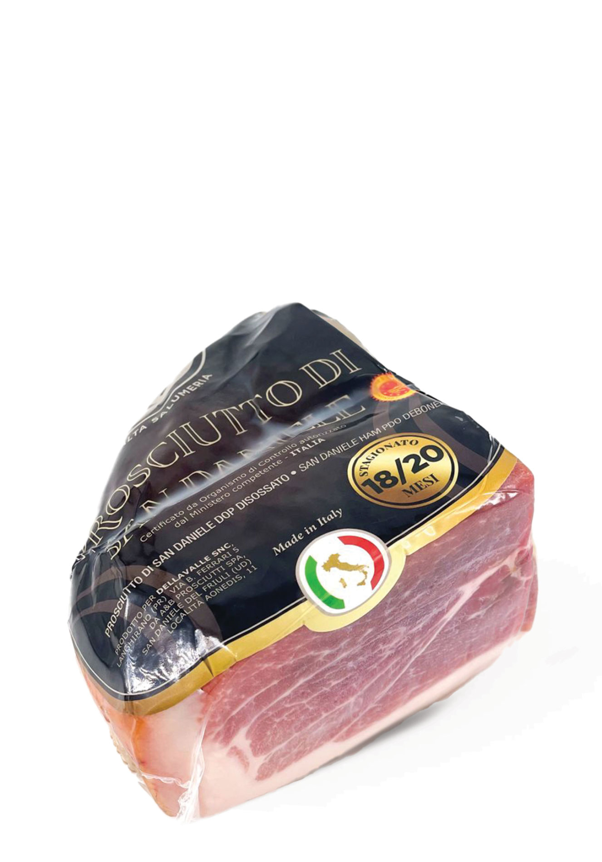 Vykostěná zadní noha (kýta) z bílého prasete s délkou zrání 20 měsíců. DOP San Daniele. Složení: vepřové maso, sůl.